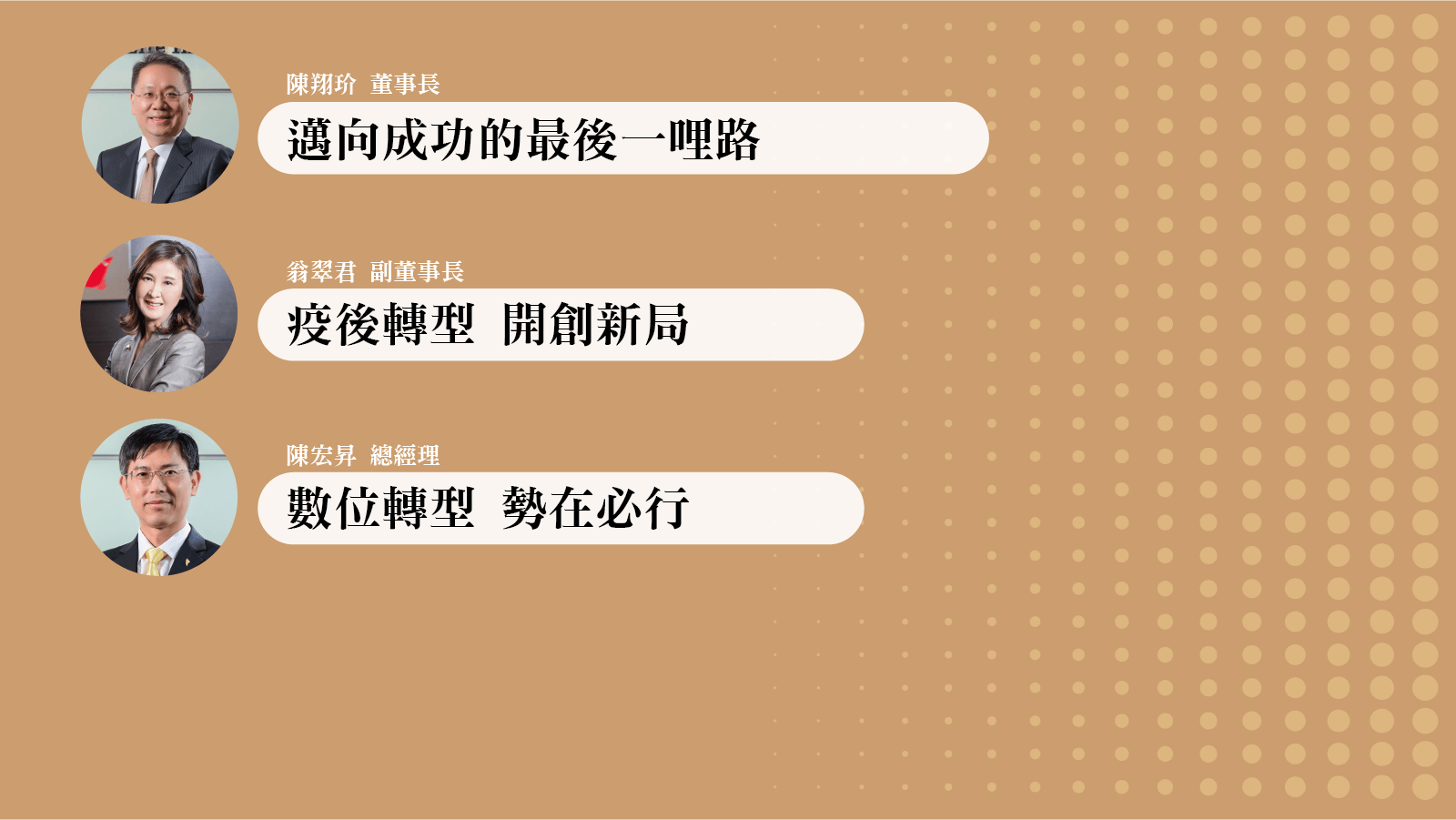 回顧過去一年,新冠病毒疫情在全世界不斷反覆發生,即使近期台灣仍有疫情產生,但不可否認的是,要完全回到疫情前的生活,仍有漫漫長路要走,感謝大家在這段期間克服種種困難,做好每天的日常作業,戮力達成各項業績目標,讓公司業績得以成長,背後的汗水及付出,公司都看到了。