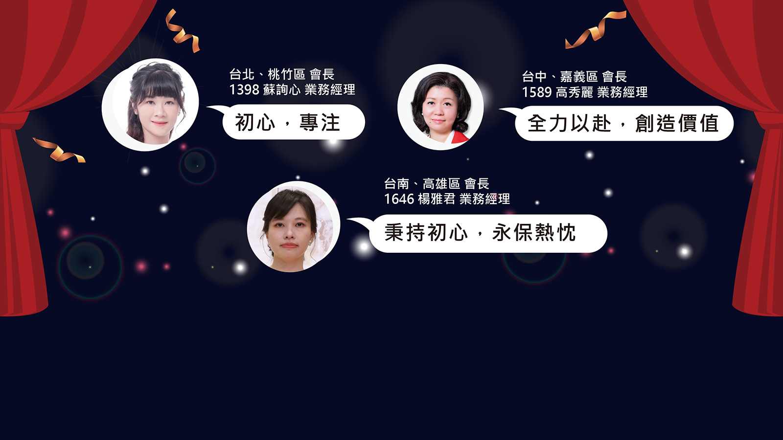 各位夥伴好,又到了一年一度的高峰競賽頒獎典禮,帶著感謝與各位共享這個光榮時刻,這一年來走過許多風雨,不只全球的局勢動盪,公司在這段時間也歷經些許紛擾,但公司的經營向來可受公評,恭賀所有登上高峰的夥伴們,就如同公司新推出的增員影片,相信「每一個成功背後,都有一群最佳教練」,各位的最佳教練已成功將您推上高峰,未來也期許大家,成為下一位保險新星的最佳教練!