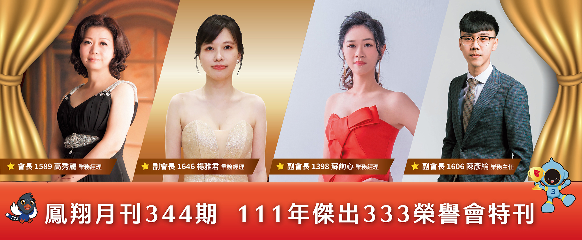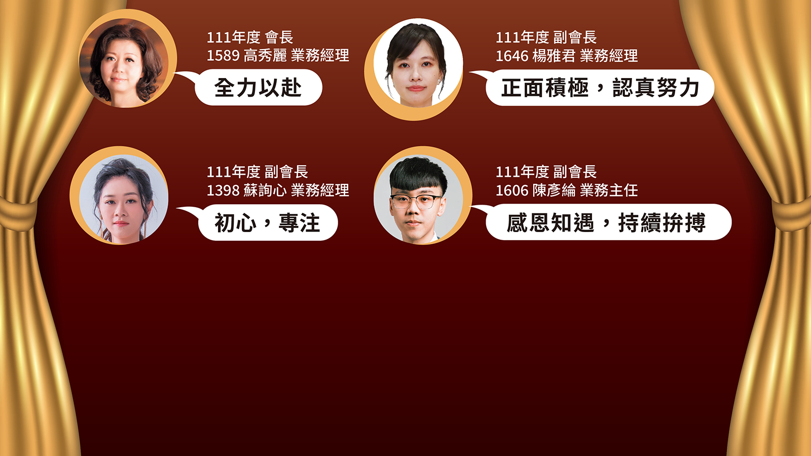 111年度會長由台中區1589高秀麗業務經理奪魁,副會長分別由台南區1646楊雅君業務經理、桃竹區1398蘇詢心業務經理,高雄區1606陳彥綸業務主任獲得榮耀。正副會長得獎獎座「金濤滾滾」聚寶盆,以兔子為主體,象徵兔兔帶財,金濤翻身好運開;富貴滾滾逼人來。勝券在握,錢潮澎湃;凌波仙子,流光溢彩,備受寵愛。另一獎座「兔財主」,設計師將台灣在地族群最具代表性的茄芷袋(帶財)、夾腳拖(脫穎而出)融入作品,打造獨一無二、爆發力十足的台客兔,獻上祝福金桔(大吉大利),彷彿是在驕傲的說:我很台、也很自豪!