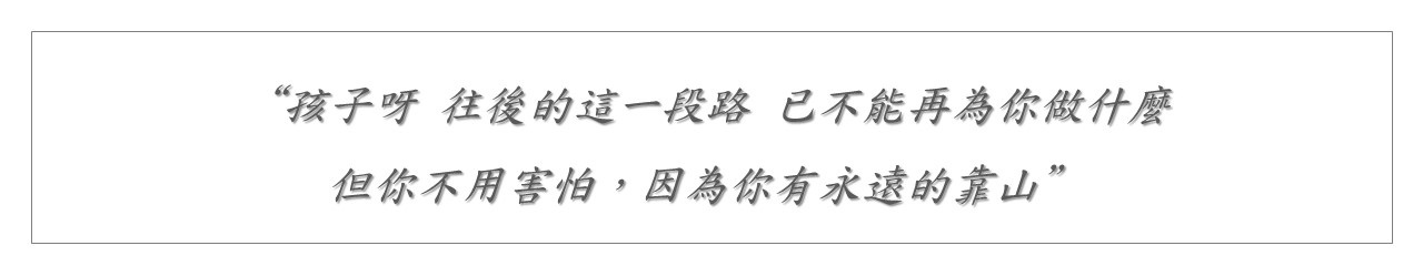 孩子呀,身為母親的我,再陪你的時間是未知數,這往後的一段路,我已不能再為你做什麼了。前方,充滿未知與挑戰,但是,你不用害怕,因為你有永遠的靠山,從一出生就開始的約定,會陪你度過下一個三十,也祝福三商美邦人壽度過無數個三十。