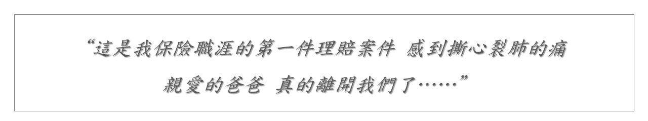 這是我壽險生涯第一件身故理賠,是如此深刻且悲痛,公司在受理文件的當天就完成結案,迅速將保險金匯入戶頭,我看著手機網銀的畫面,愣了幾秒後潸然淚下,感到撕心裂肺的痛,意識到這是爸爸的身故保險金,親愛的爸爸,真的離開我們了……