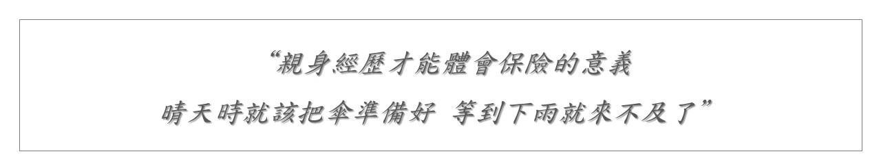 非常慶幸在二十年前有幫先生投保防癌險,所以我們沒有經濟的壓力,在醫院治療的日子裡,看過其他的病友因為經濟的考量苦等健保房,我不敢想像如果沒有保險,我們的抗癌之路應該會倍加辛苦,雖然住院治療有健保但出院休養的開銷才是可怕的,親身經歷過才能深深的體會保險的重要性,所以晴天時就該把傘準備好,若等到下雨才找傘就來不及了!