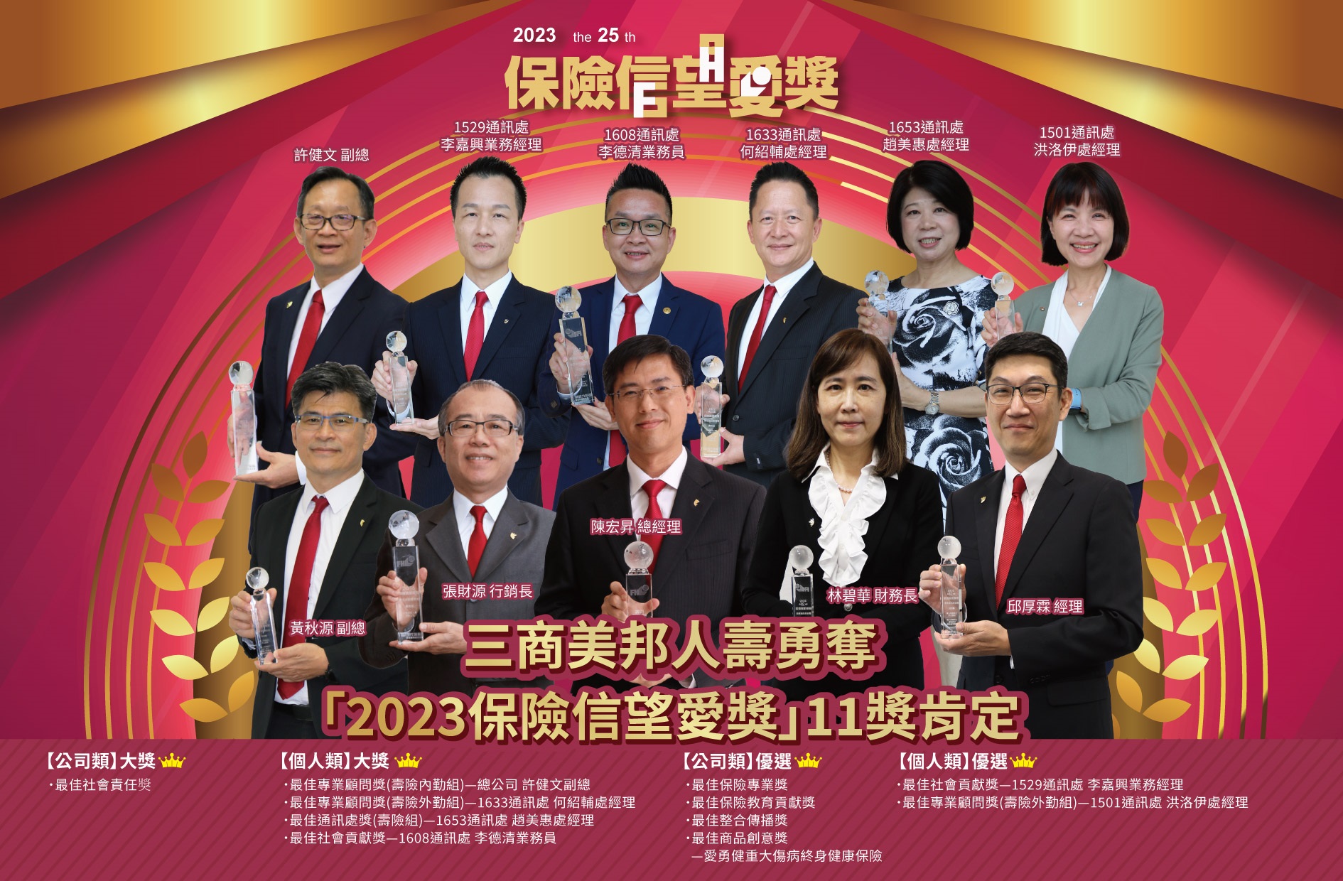 公司榮獲「2023年第25屆保險信望愛獎」公司及個人類11項獎肯定,代表公司在推動社會福祉、保險教育和商品創新所取得的卓越成就,而第一線業務人員的優異表現,更展現了我們在保險業界的領導地位。未來公司將持續以「專注經營,穩健成長」為中長期經營主軸,並以「穩健財務、專精通路、數位轉型、擦亮品牌、贏得客戶」等五大策略,持續深耕國內市場,繼續朝向下一個三十年邁進。