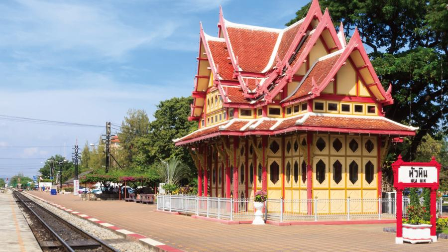 【華欣火車站】建於1911年,是泰國最古老的火車站之一,並被譽為泰國最美麗的火車站。車站的建築風格融合了維多利亞式與泰式元素,外觀色彩鮮豔,內部裝潢典雅。此外,車站內還設有專為皇室設計的「皇家候車室」,可供遊客參觀。