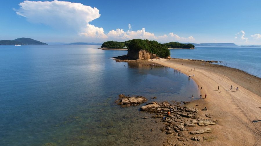 【天使之路】位於淡路島南部,是一條隨著潮汐變化而出現的沙灘小道。 當潮水退去時,這條沙道連接著本島與附近的小島,形成一道獨特的景觀。傳說中,這條路是天使通往人間的道路,因此得名「天使之路」。遊客可以在此漫步,欣賞美麗的海景,並在日落時分體驗浪漫的氛圍。