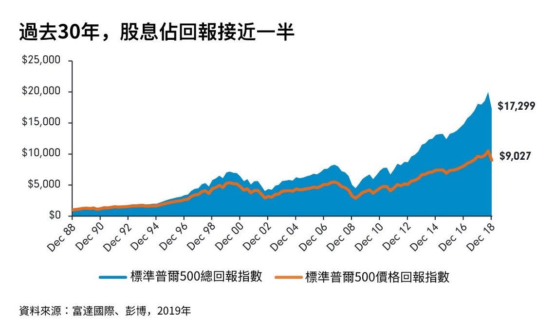 以美國股市為例,過去30年的總報酬中,接近一半是來自股息收益。